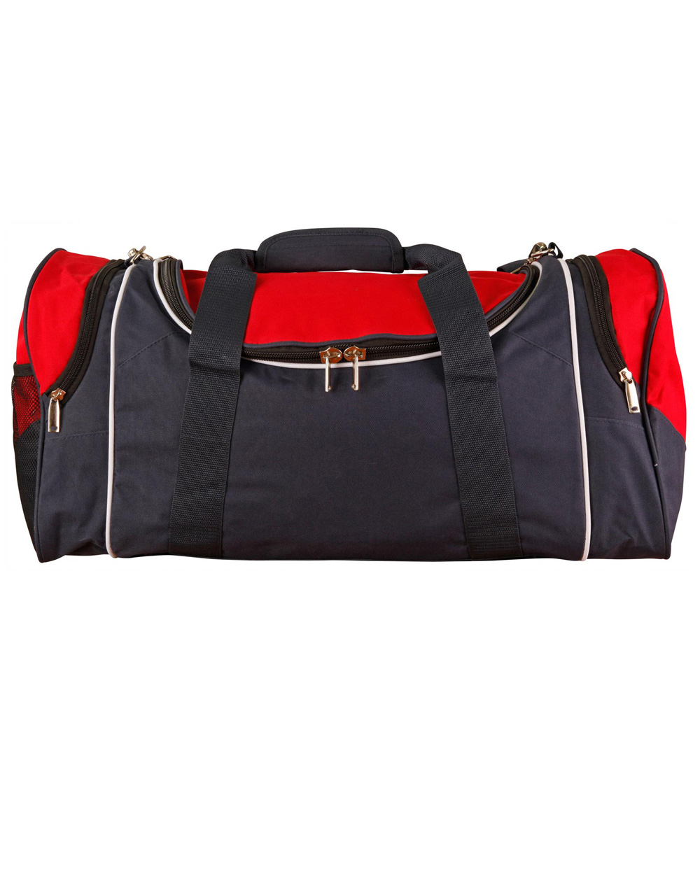 Features: Large U shaped double zippered compartment. Zippered end compartment. Two carry handles with Velcro closure. Mesh pocket on one side. Adjustable / detachable webbing shoulder strap with padding. Studded base for durability.