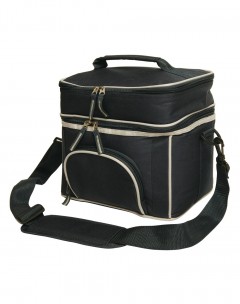 Features: Insulated cooler. Two zippered compartments. Adjustable shoulder strap. Double zippered puller. Zippered pocket on front. Embroidery accessible.