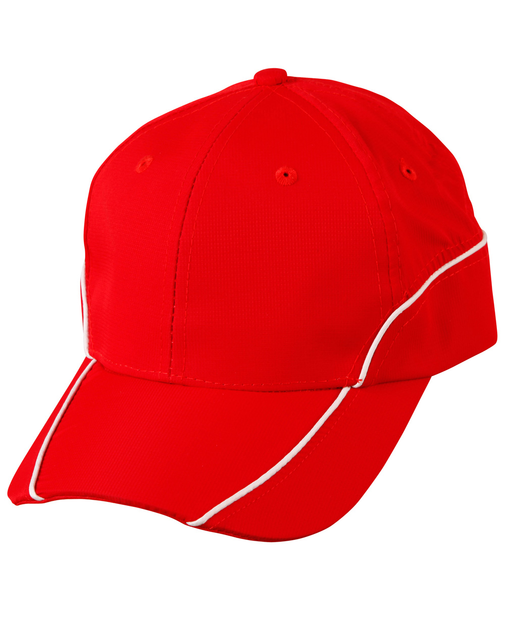Description: 6 panel structured laid back front. Ripstop with polyester mesh lining, contrast trim across peak & crown. Short velcro crossover.
