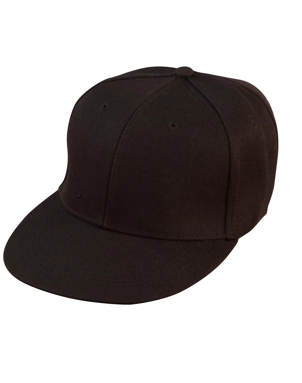 Description: 6 panel structured design with flat peak. Padded sweatband made of cotton fabric. Plastic snapback fastener. Stitched eyelets.