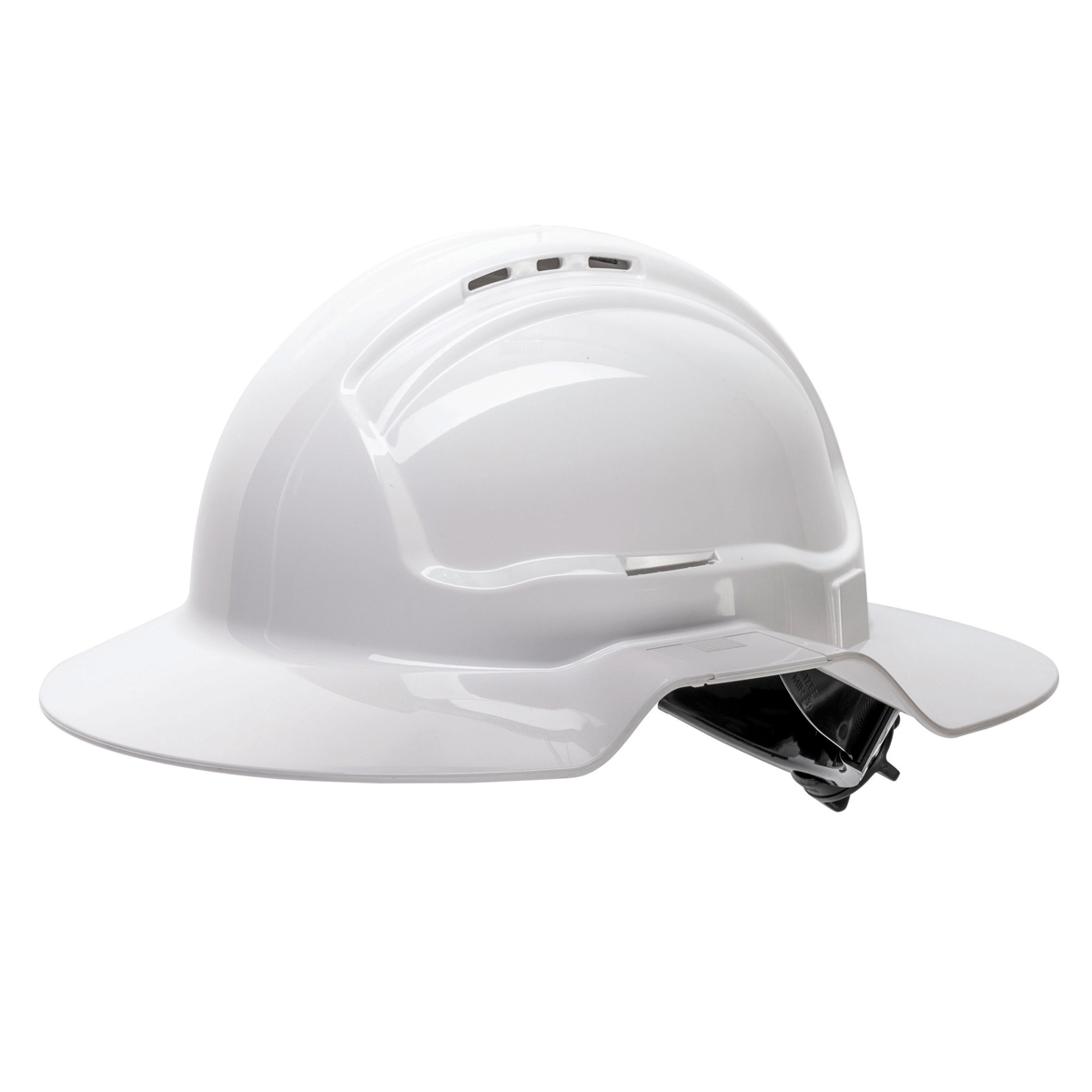 Force360 Broad Brim Hard Hat, Vented, 6 Point Ratchet Harness, Type 1 HPFPRBB57R.WH